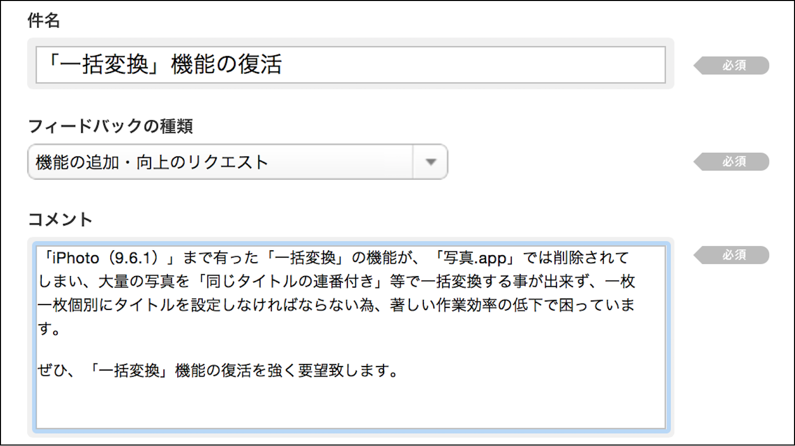 以前iPhotoでは、画面上で複数の写真を選んで、タイトル+連番というように一括でタイトル名を変える機能がありましたが、写真になって同じようなことをしようとしたところ、どのようにやればいいかわかりません。