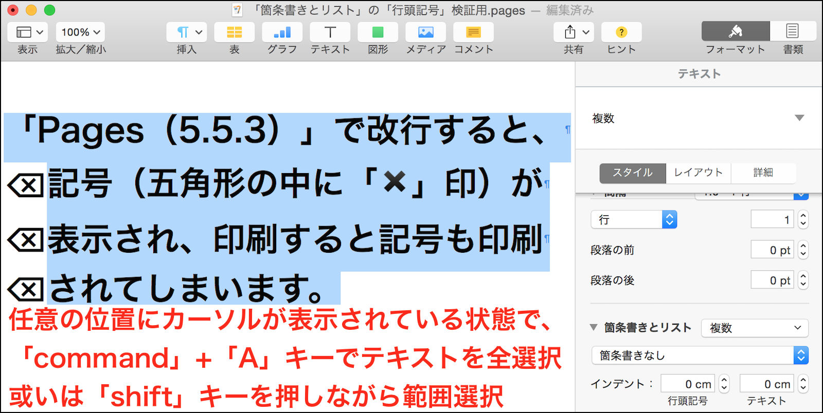 ● 書類の任意の位置にカーソルが表示されている状態で、「command」+「A」キーで、テキストを全選択。