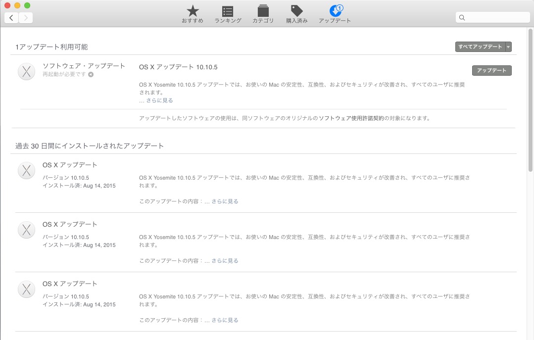 その後に、10.10.5のアップデート、再起動を2度繰り返しましたら、10.10.5へアップデートが完了しました。