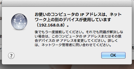 私はOSX10.8.4ですが、起動時、スリープからの復帰時にIPアドレスがかぶっていないにも関わらずこのダイアログが表示される事があります。