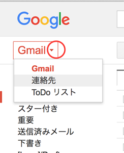 連絡先を開けるのは、図のように、Gmail の右横の逆3角のアイコンをクリックすると出てきます。