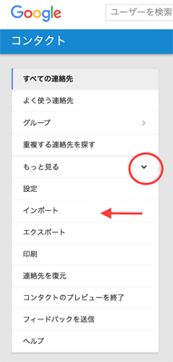 次に連絡先(コンタクト)のメニューを表示し、もっと見るをクリックすると、インポートやエクスポートが出てきます。