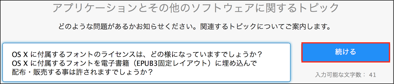 「該当するトピックがない」> 問合せ内容を入力 >「続ける」ボタンをクリック。