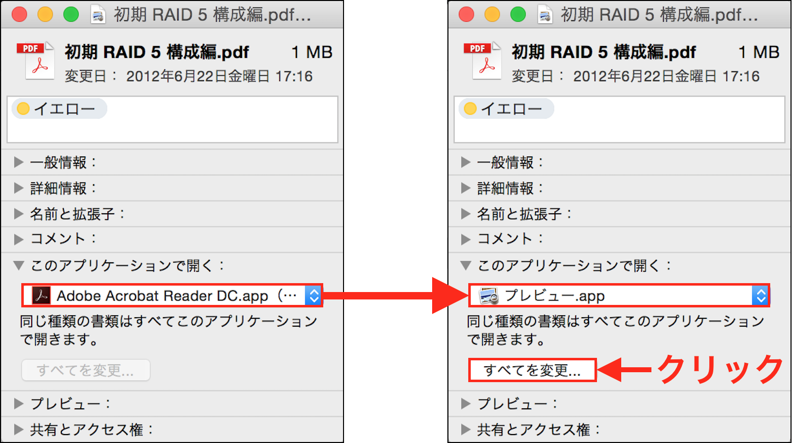 ケーションで開く」の項目を「プレビュー.app」に設定し、「すべてを変更」ボタンをクリックして見て下さい。