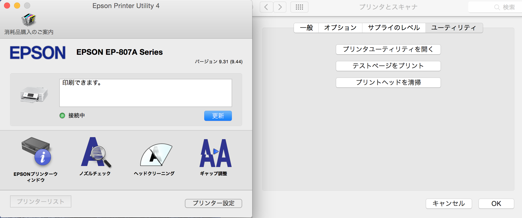 プリンターはEpsonです.色々見てみたのですが, /Library/Printersにあるアプリを開けてもプリントキューが出てユーティリティにはたどり着けません