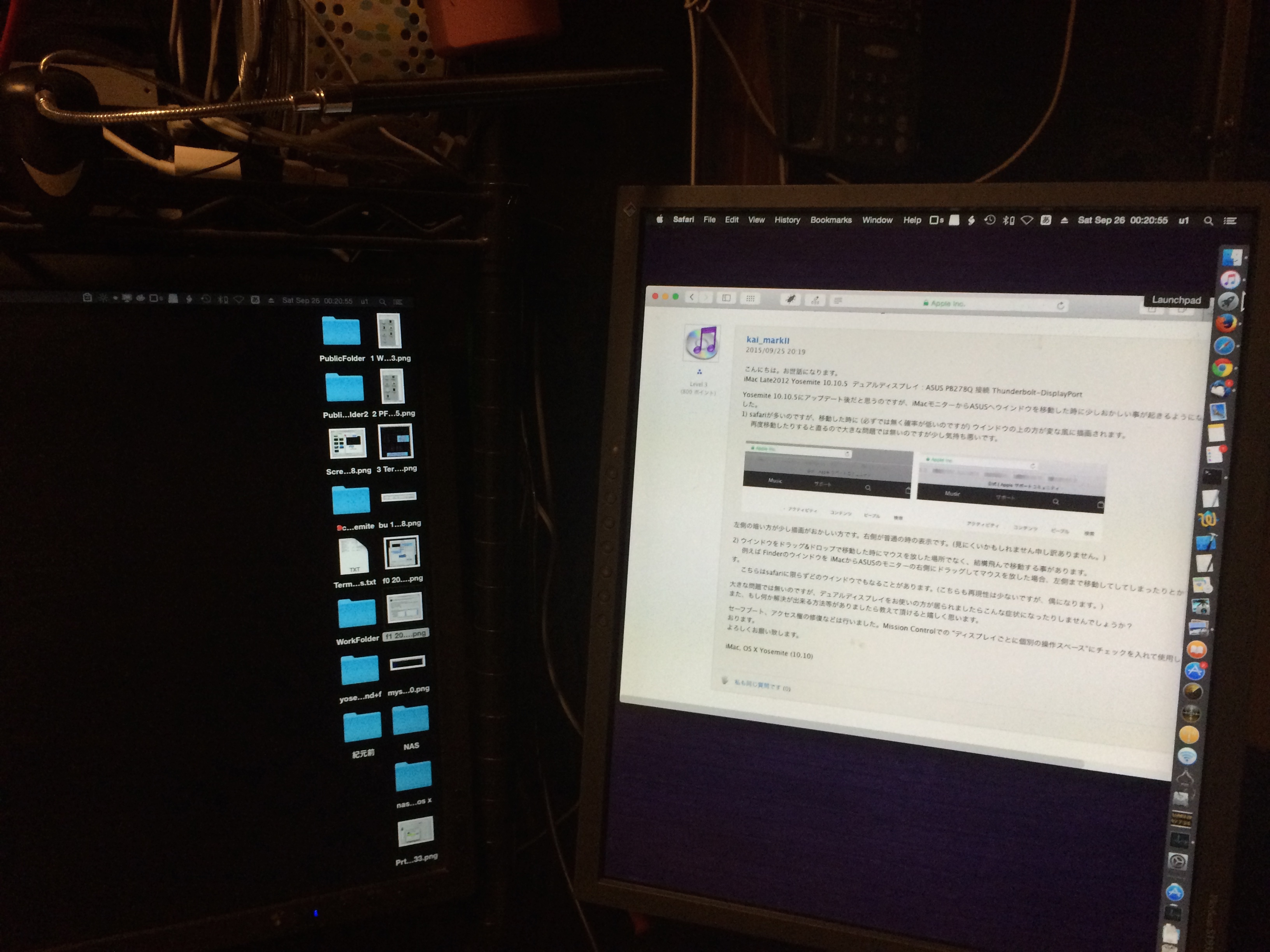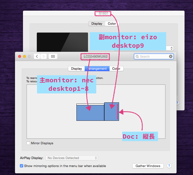 ウ〜ム、「ASUS | iMac」には少し引っかかります。これとDocの位置の関係が関連していそうに簡易ます。自分の場合、「nec|eizo」として、Docを右橋にしていますが、これを左端に設定すると何か不都合を生じて出来なかったように思います。