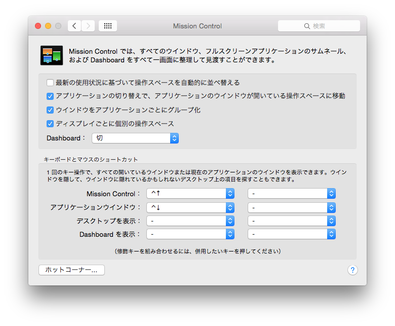 セーフブート、アクセス権の修復などは行いました。Mission Controlでの "ディスプレイごとに個別の操作スペース"にチェックを入れて使用しております。