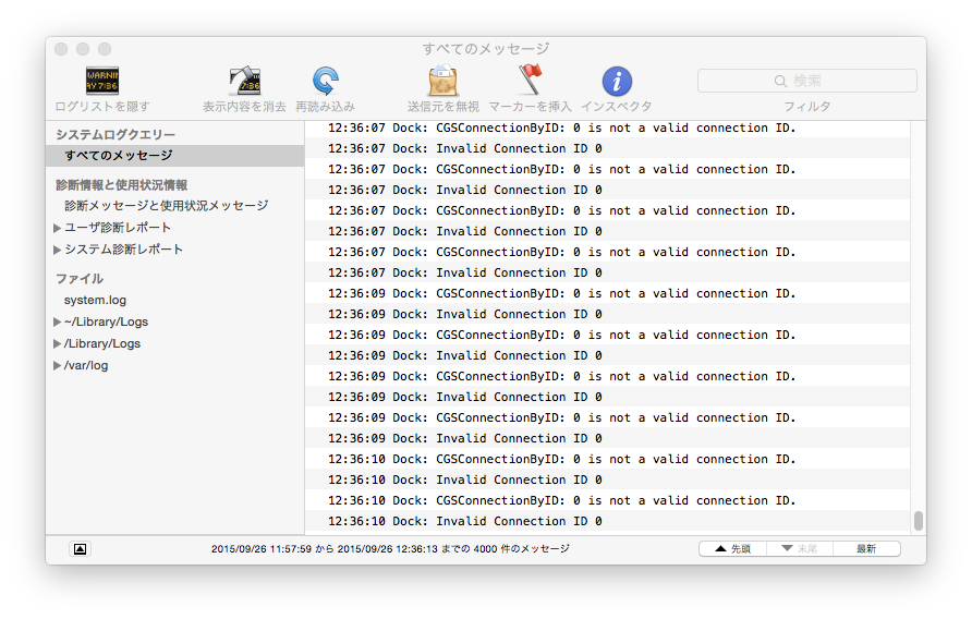 - 「アクティビティ・モニタ」の位置がDocに部分的に隠れて出てくる。その隠れ方は毎回違う。