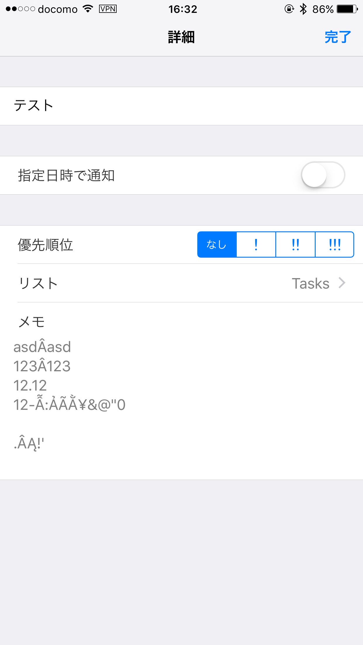 この問題はMacからiPhoneに同期する時にだけ起こるようです。iPhoneでタスクを作成し、メモを日本語で入力した場合は文字化けは起こりませんでした。