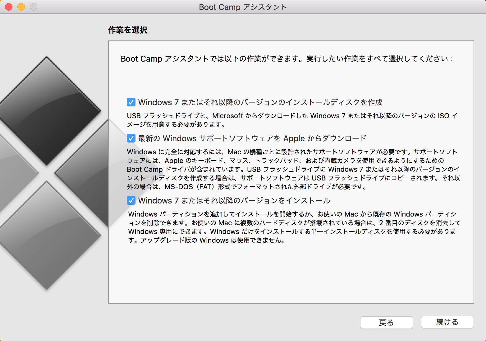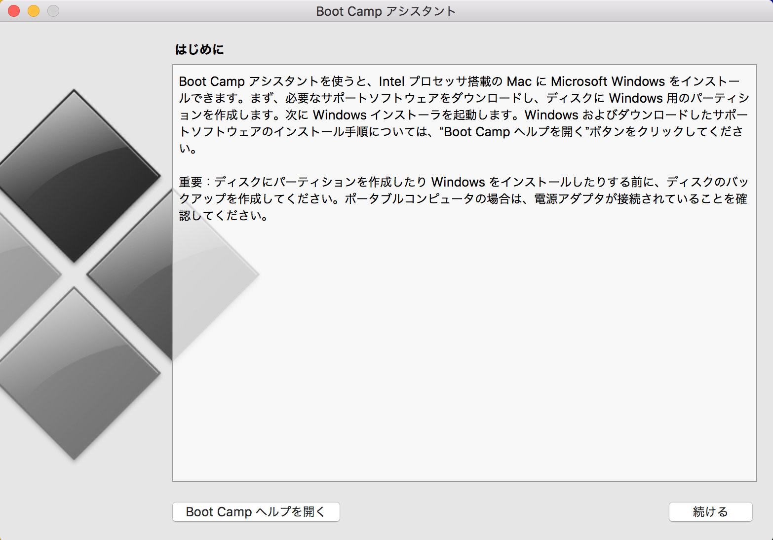 3) Boot Camp アシスタントで「続ける」を押し正規の手順通りに進める