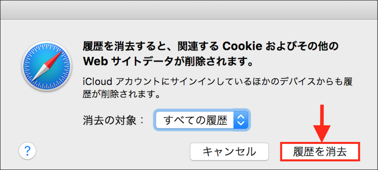 「Safari」メニュー >「履歴を消去」、或いは「履歴」メニュー >「履歴を消去」を選択すると表示されるダイアログで、