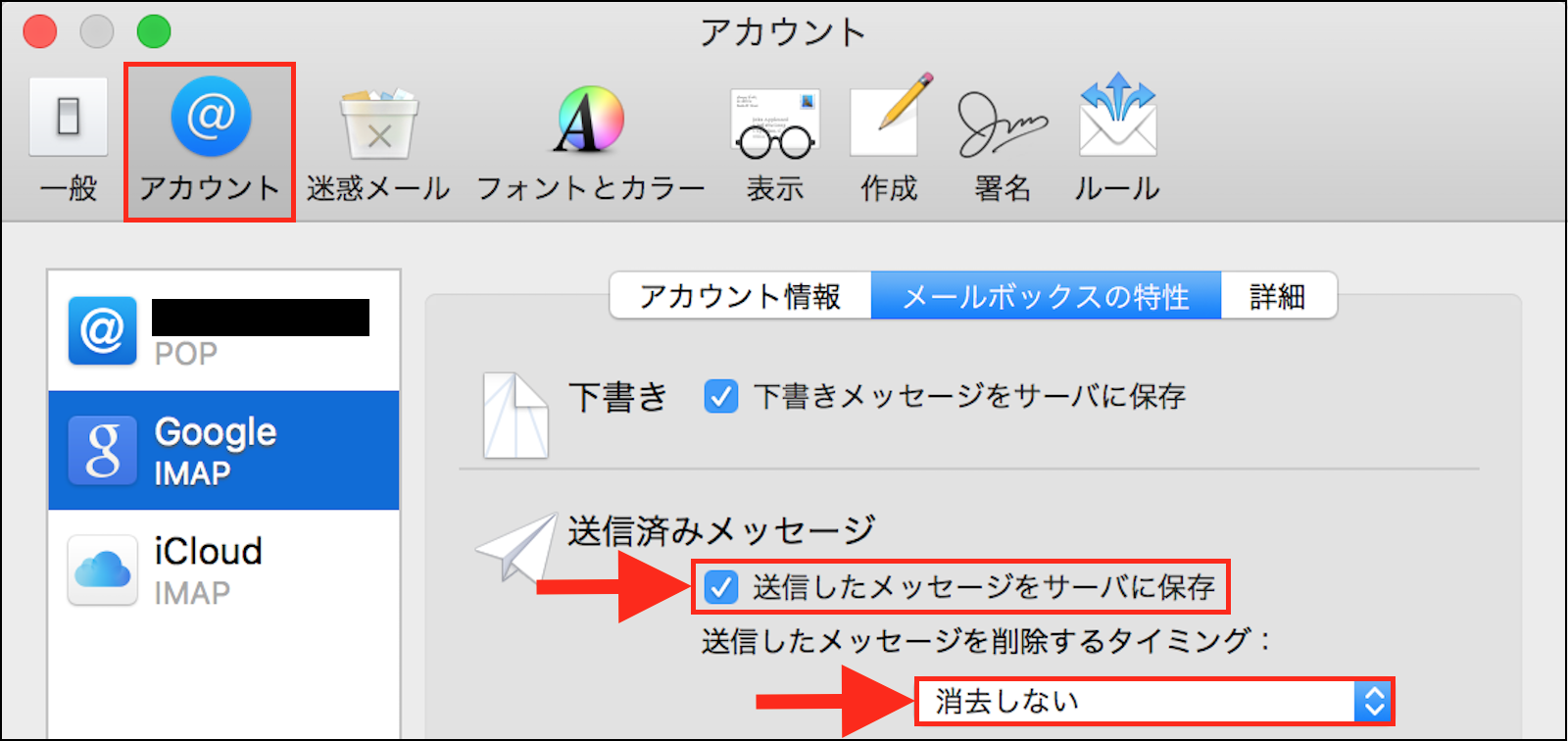 ①「送信済み」メールボックス内に「このMac内」という項目が有ります。