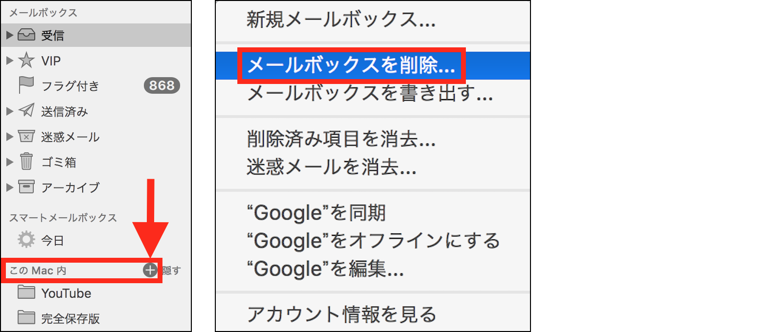 ④「このMac内」という1項目は、他のメールアカウントと同等に並んでいます。
