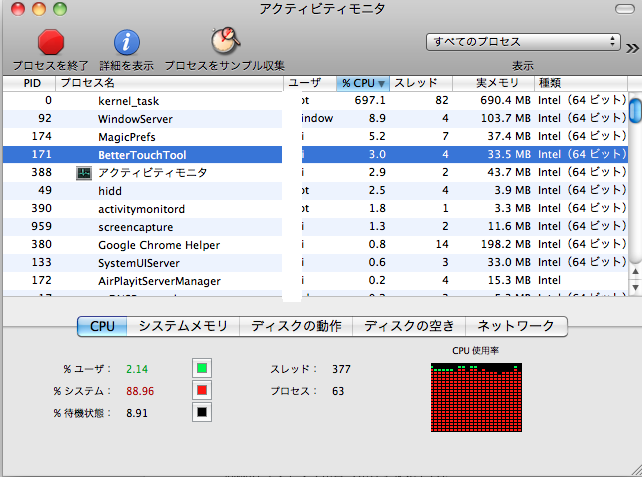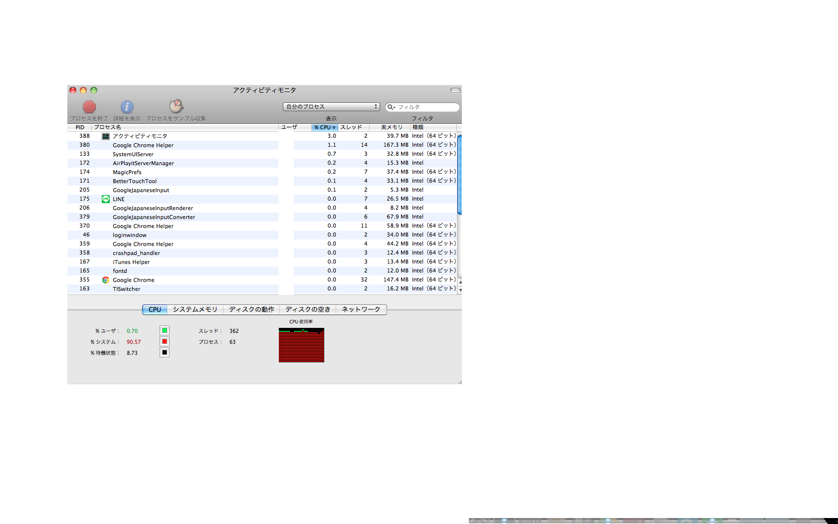 アクティビティモニタでCPUの使用率を確認するとシステム項目がかなり高くなっていますが何に何%使っているのかが全くわかりません(画像を添付します)