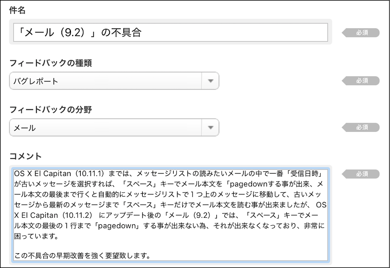 メールはVer. 9.1ですが、ひとつ手前のMacOSのメールでは、メールウィンドウの左側のリストでメールを選択し、右側の本文を読む際に、page upとpage downのキーで、メール本文エリアをスクロールすることができていたのですが、MacOS El Capitanのメール9.1では、page upまたはpage downキーにより左側のリストエリアがスクロールしてしまいます。