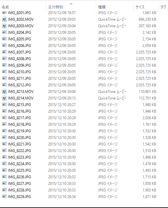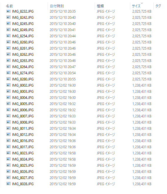 2,025,725KB以外に1,238,431というのもありました。見ていただいてわかるように、異常なサイズのやつは、表示上容量が全く同じです。同時間帯で撮っているのもありますが、ボタン長押しの連写ではなく、ボタン短押しの連打で撮ってるだけなんです。