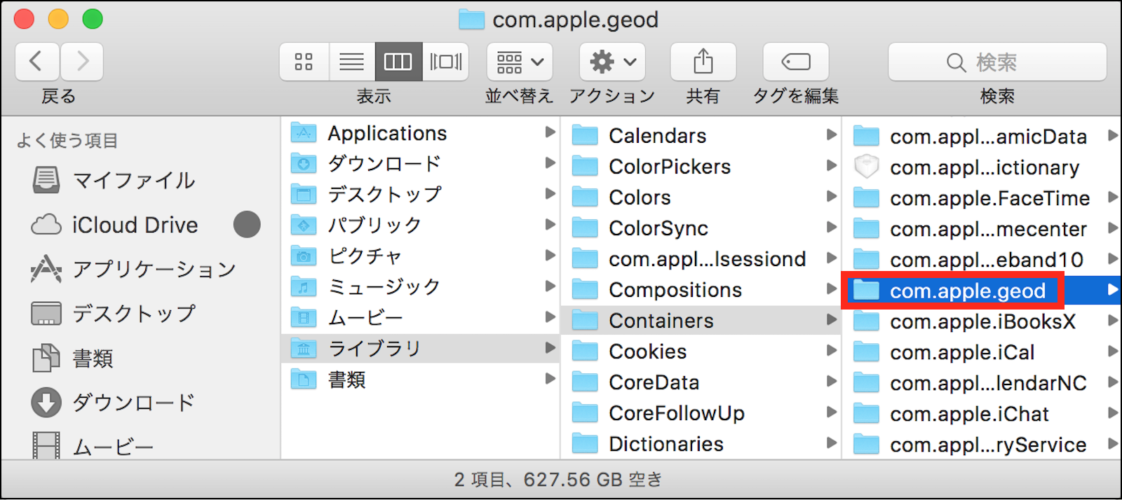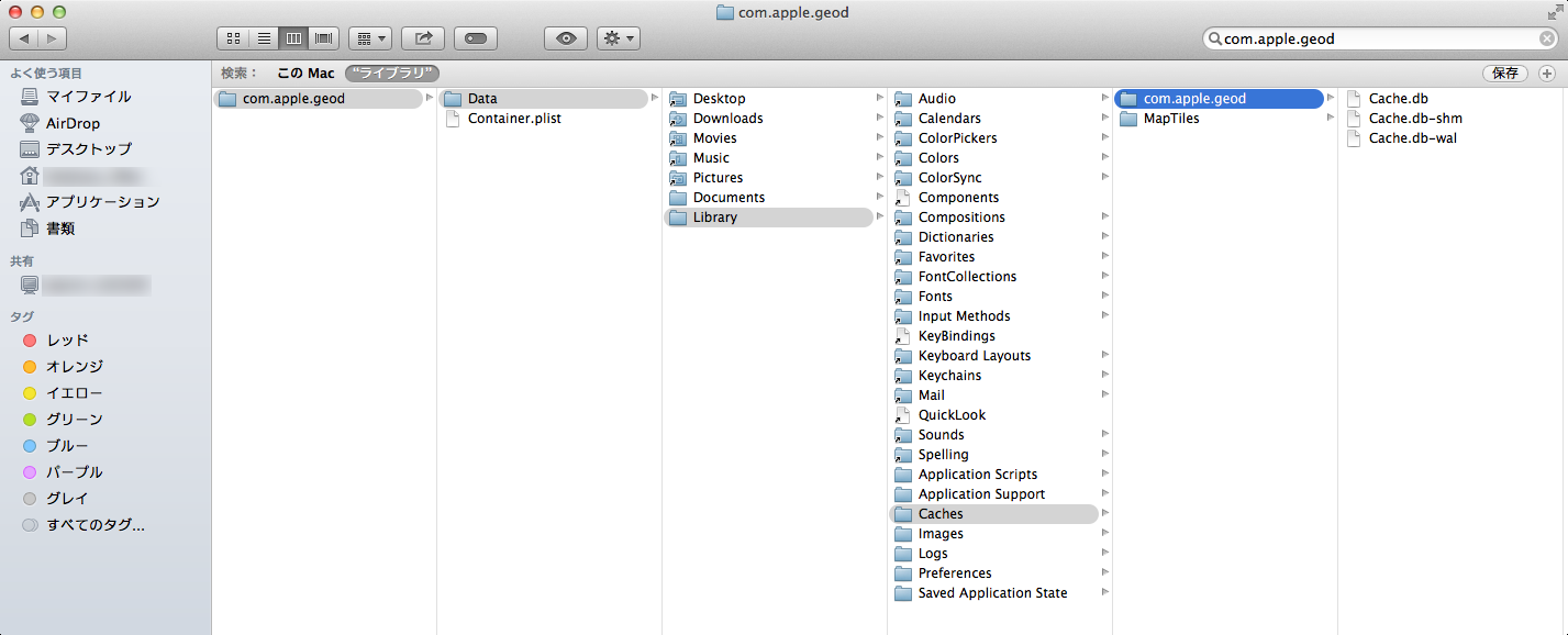 フォルダCaches以外にApplications Scriptsの階層にエイリアスcom.apple.geodがありました。