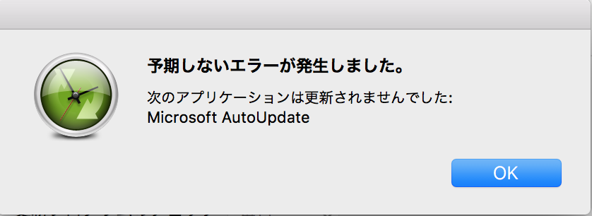 Mac OS Xは最新版を使用しておりまして、Office for Mac 2016(Office365ではなく、買い切りのプロダクト製品)の更新プログラムをチェックしてインストール(ダウンロード?)を試みるとエラーとなってしまい、更新プログラムを取得できません。