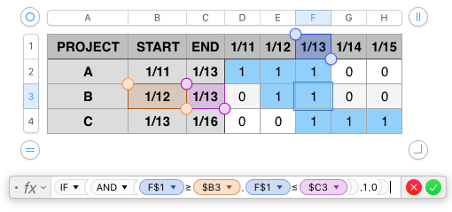 1)セルにIF関数を入力する場合は、≤≥の記号が使えるので、開始日と終了日の間に1行の日付が入るかどうかで真偽を判断します。セルの参照方法(行列の絶対/相対参照)に注意してください。 ”1”の数字は白色とか透明に変更したり、空白にすることもできると思います。