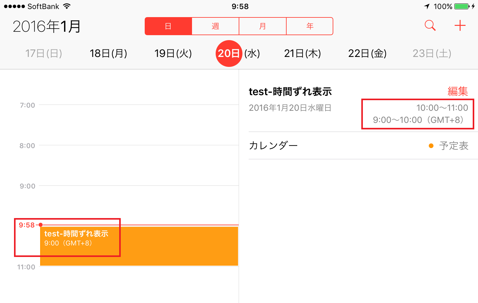このやり方ですと、予定表示内に二つの時刻が表示されるのですが、片方の時刻が1時間ずれて表示されます。