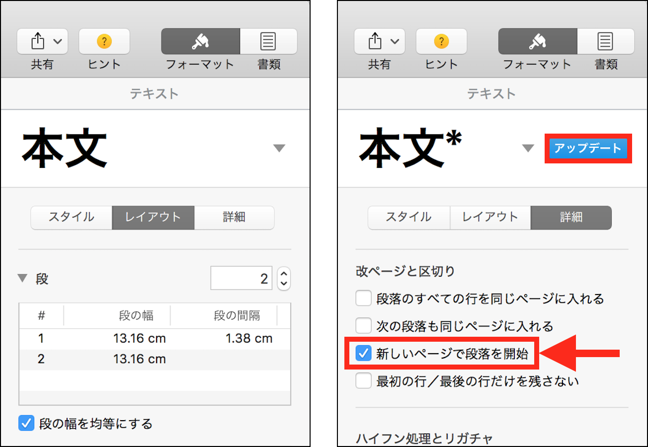 「フォーマット」>「レイアウト」タブで「段」の設定を行い、「詳細」タブ >「改ページと区切り」の設定で、
