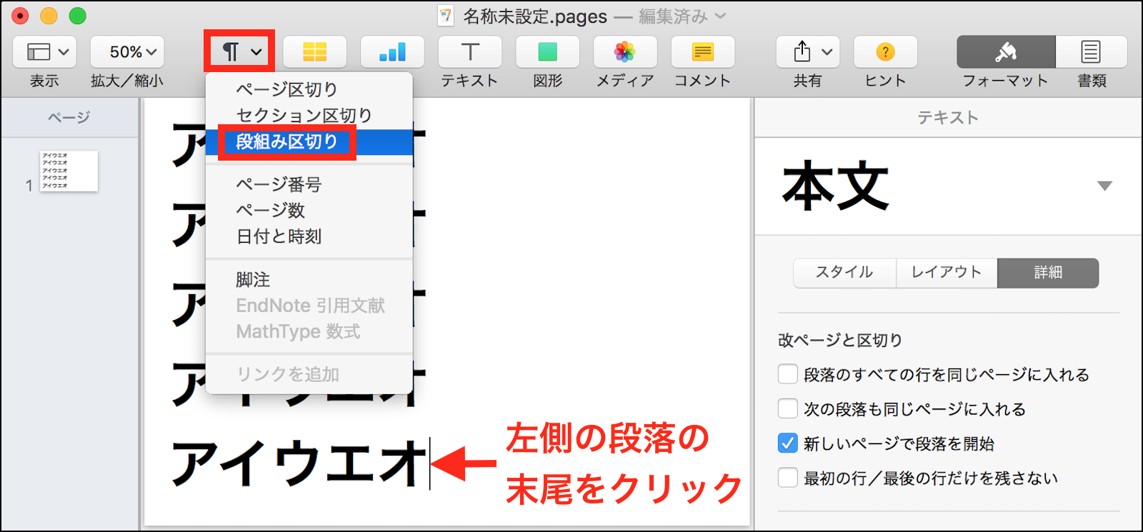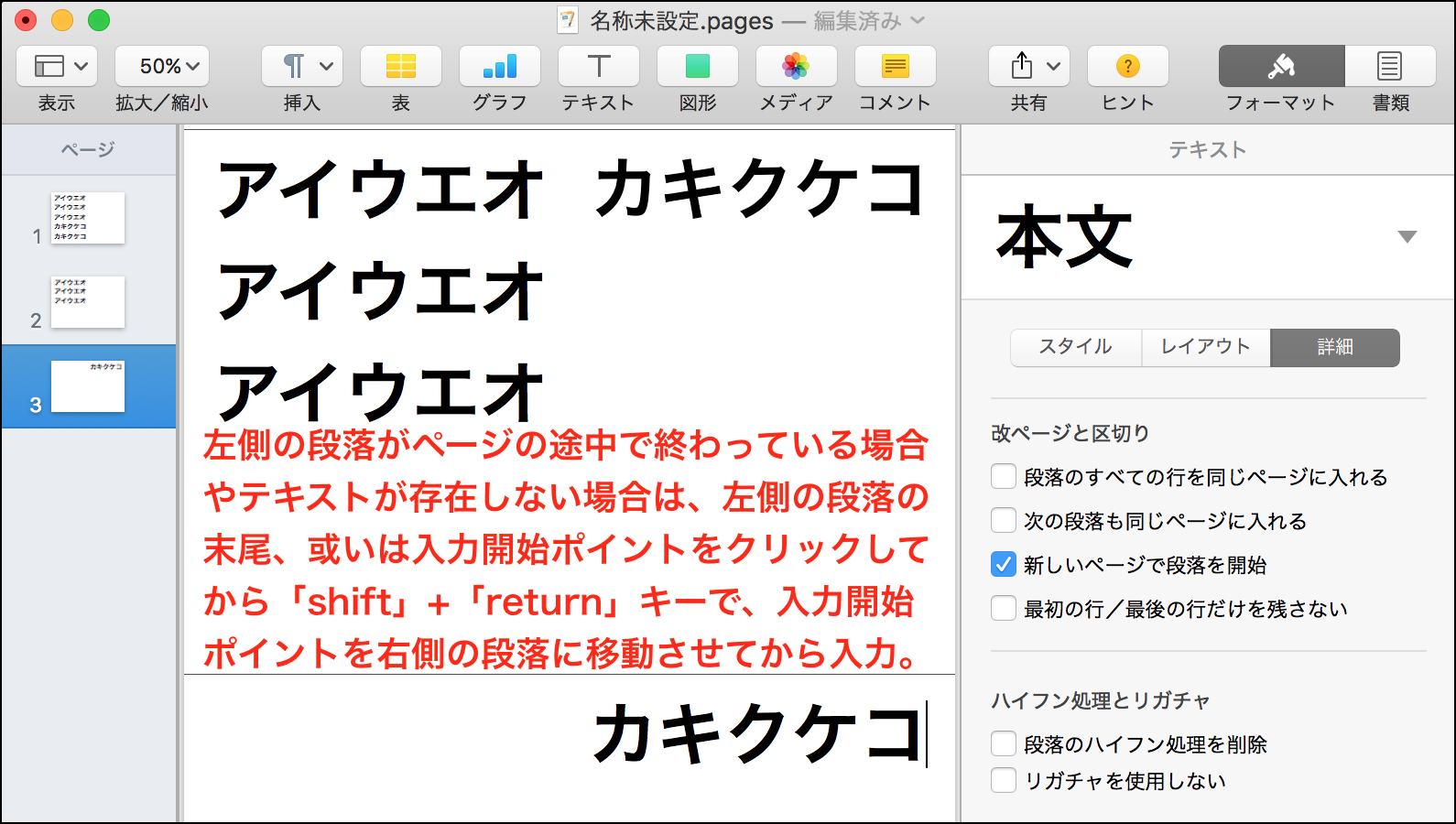 T22T さんがお書きの様に、「Pages(5.6.1)」の場合は、入力時に一手間掛ける必要が有ります。