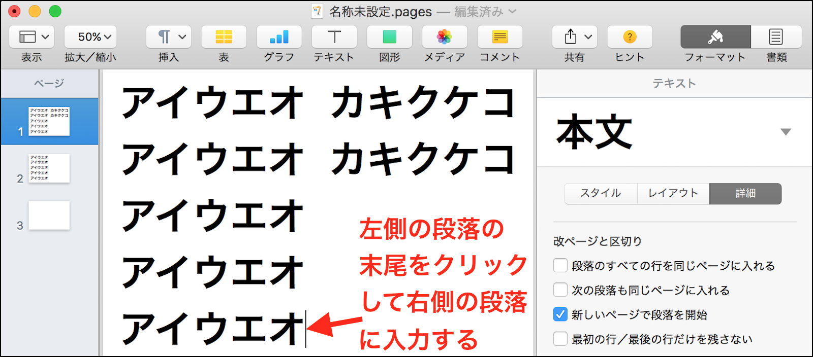 ③ 左側の段落がページの途中で終わっている場合やテキストが存在しない場合は、左側の段落の末尾、或いは入力開始