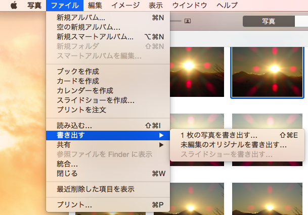 メニューバーの、「書き出す」には、2つあります。「未編集のオリジナルを書き出す」が、< データの大きさを変えない >書き出し方です。「1枚の写真を書き出す」は、大きさが変わります