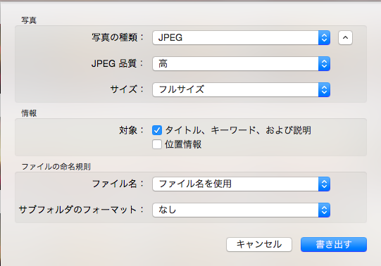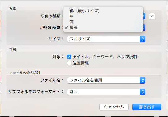 私の例ですが、4.6MBの画像を、「1枚の写真を書き出す」で書き出すと、3.3MBになりました。