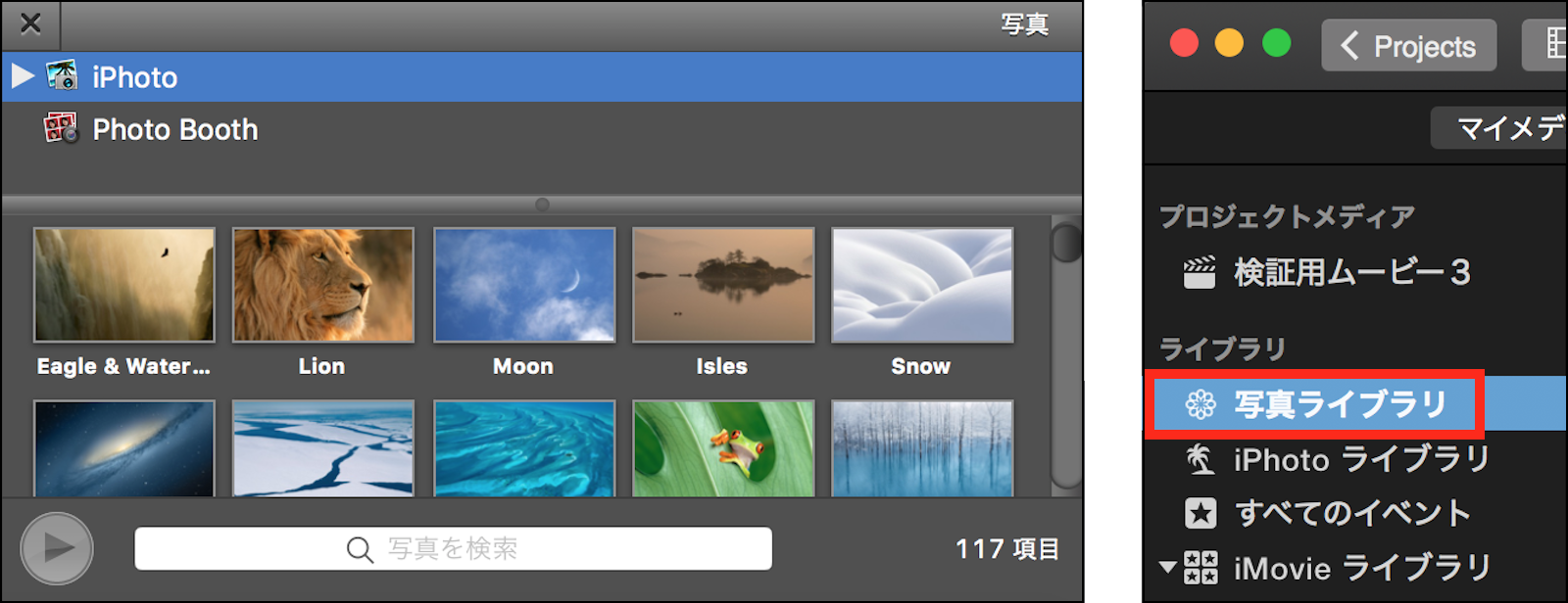 NoriBay さんもお書きの様に、「iMovie(10.1.1)」では「ライブラリ」リストに「写真ライブラリ」が表示されます。