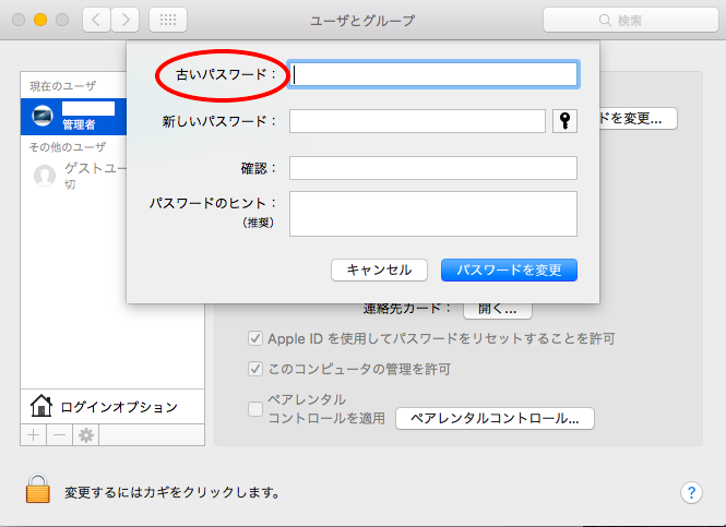 「システム環境設定」-「ユーザーとグループ」‐「パスワードを変更」