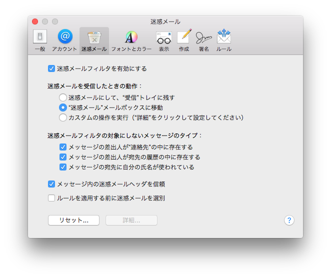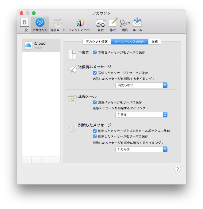 試しに、OS Xの「メール」ソフトで迷惑メールの設定を「削除しない」から「一月で削除」に設定を変えてメールソフトを再起動してみてもやはり削除されません。