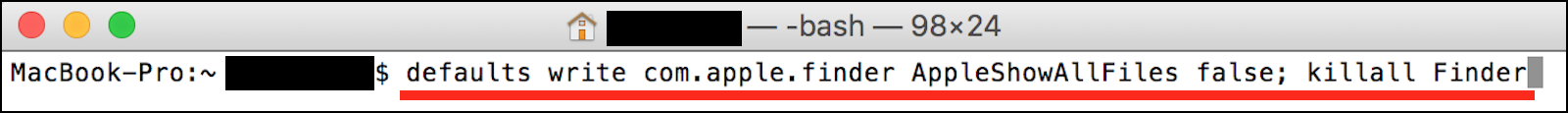 defaults write com.apple.finder AppleShowAllFiles false; killall Finder