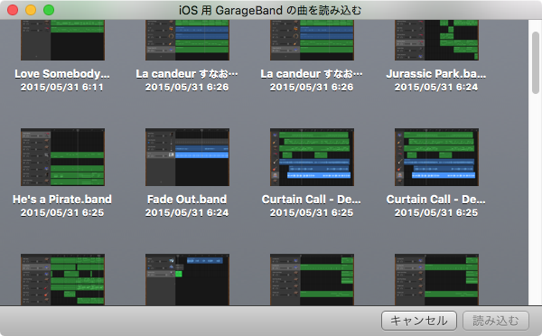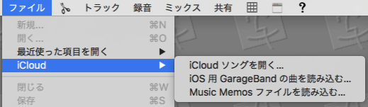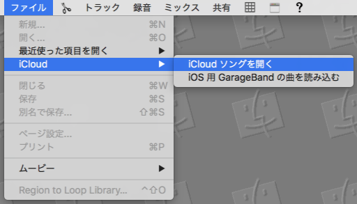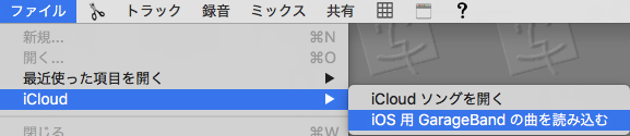 一方で、MacのGarageband.appのファイル>iCloudにある、iOS版のソングを読み込むのコマンドを実行するとiPhoneで作成したプロジェクトを表示できました。