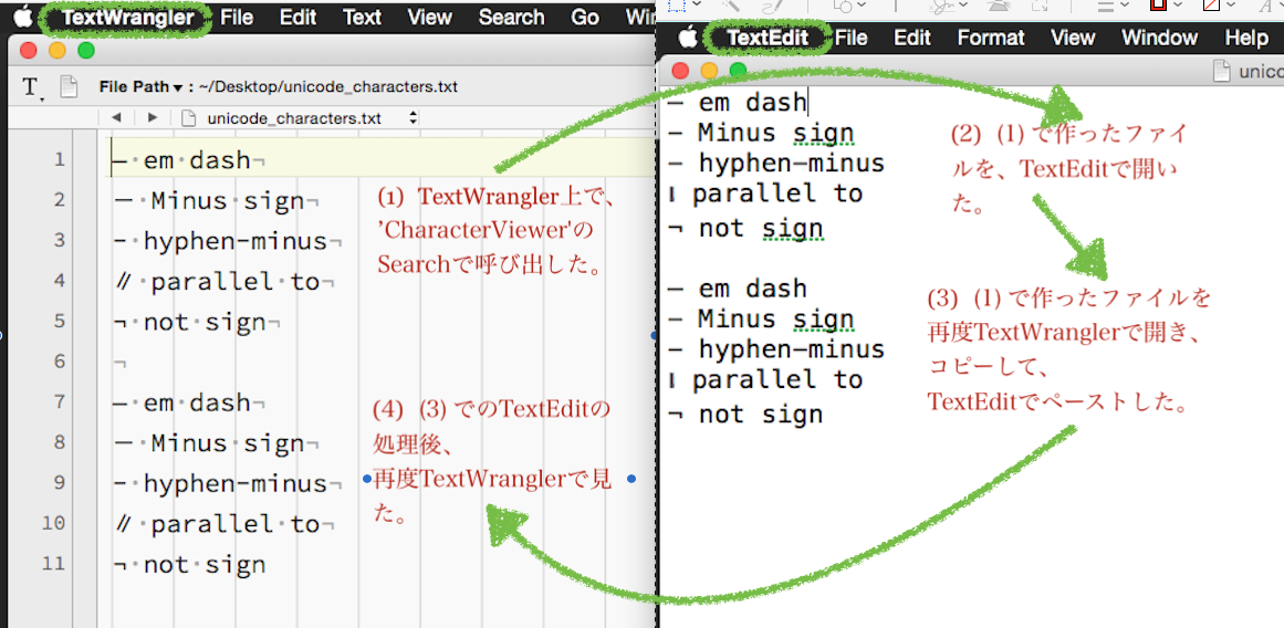これで、4つの文字(EM DASH, MINUS SIGN, HYPHEN MINUS, PARALLE TO, NOT SIGN)を入手する準備をしてから、
