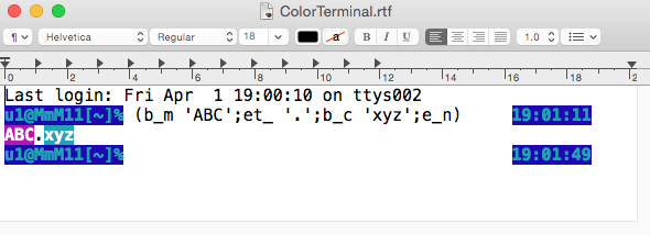 あるいは、以下のスクリプトでは、色付きテストを shell と TextEdit の双方に出力します。