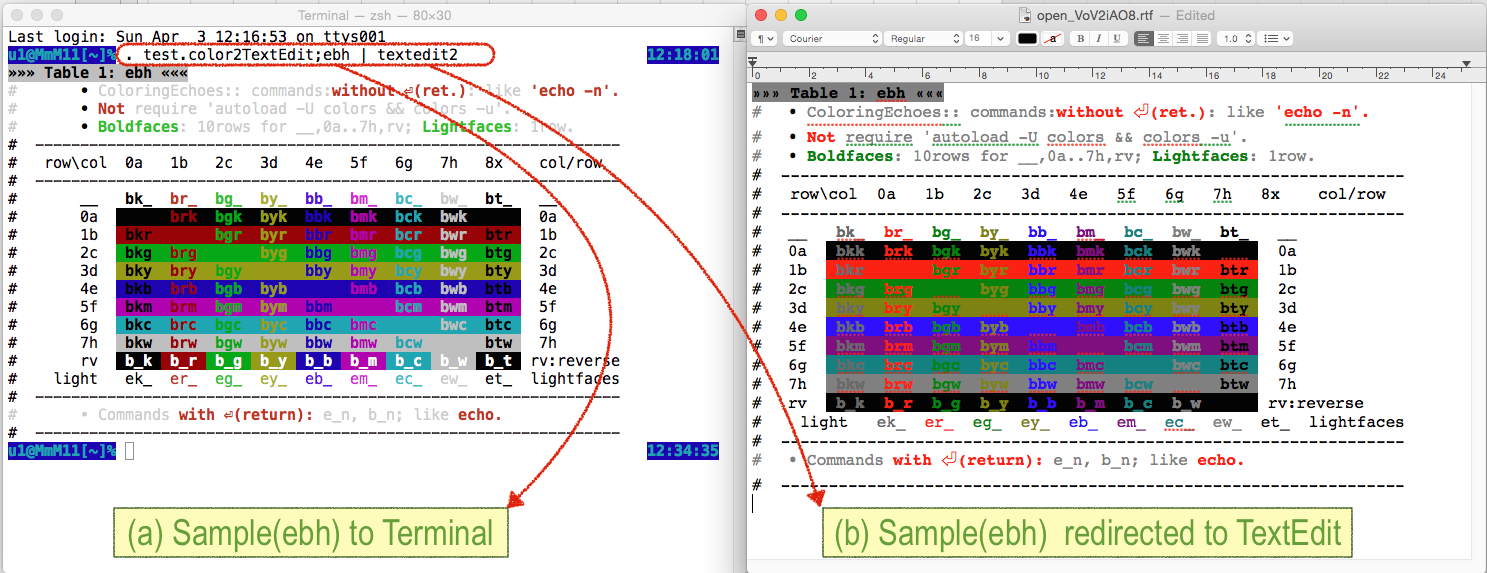 ターミナルで、手動で上記スクリプト()の色調整をするためのスクリプトをターミナルで動作させ、そのスクリプト(test.color2TextEdit)を読み込(source command: .)、test.color2TextEditパイプ渡しをしました、図4。