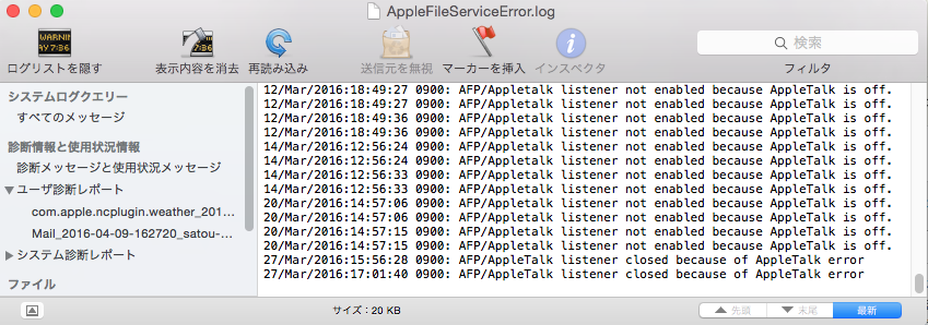 エラーログを検索 DirectoryService.error.log. Backup/87GAppleFileServiceError 2.log. AppleFileServiceError.log. 以上 3種類のlogがでました。