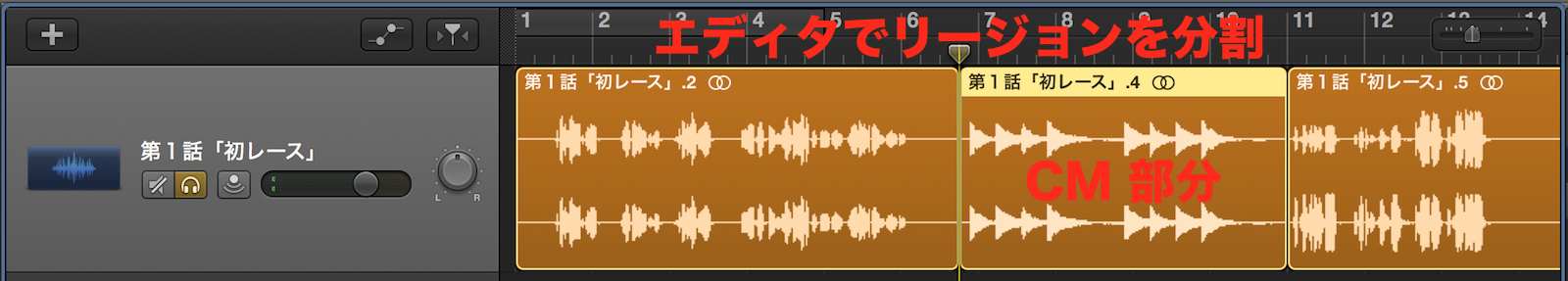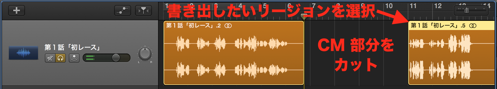 1時間ぶっ続けで単一のトラックに録音して、CM部分をカットし、分割されたリージョンをそれぞれ単一のトラックに移し、ソロ機能を使ってひとつひとつのトラックを別データとして書き出す。