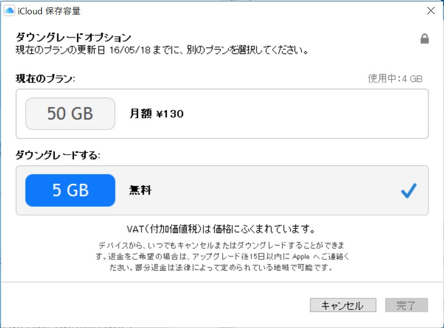 ダウングレードオプションで5GBに戻しても完了が押せない