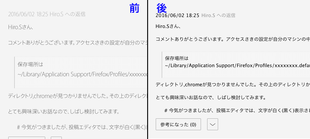 Name: ASC - Thread URLs: https://discussionsjapan.apple.com/thread/* https://discussionsjapan.apple.com/message/* p, span { font-family: "Lucida Grande" !important; color: #000000 !important; } .meta-posted, .reply-date, .j-inresponse-to span { font-size: 16px !important; } .jive-rendered-content, .jive-rendered-content p, .jive-rendered-content p span { font-size: 16px !important; line-height: 1.5em !important; }
