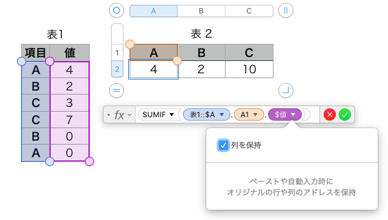 追記: 例えば、Numbers.app (ver. 3)では、下図のように表1に、3種類(A, B, C)の項目に対応する数値が入力されている場合、表2の1行目には項目名が入力されており、表2の2行目に、それぞれの項目についての数値の合計値をSUMIF関数で集計しています。 テスト値と合計範囲の引数については、列を保持しておくとオートフィル機能やコピペを使って集計しやすくなると思います。