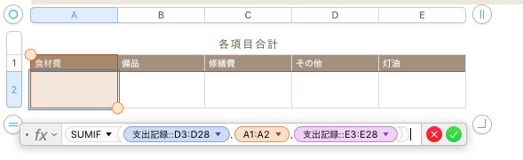 SUMIF関数の最初の引数は分類の入っている場所を指定します。なので、支出記録::D3:D28 となってるのは支出記録::C3:C28(分類の列)では?
