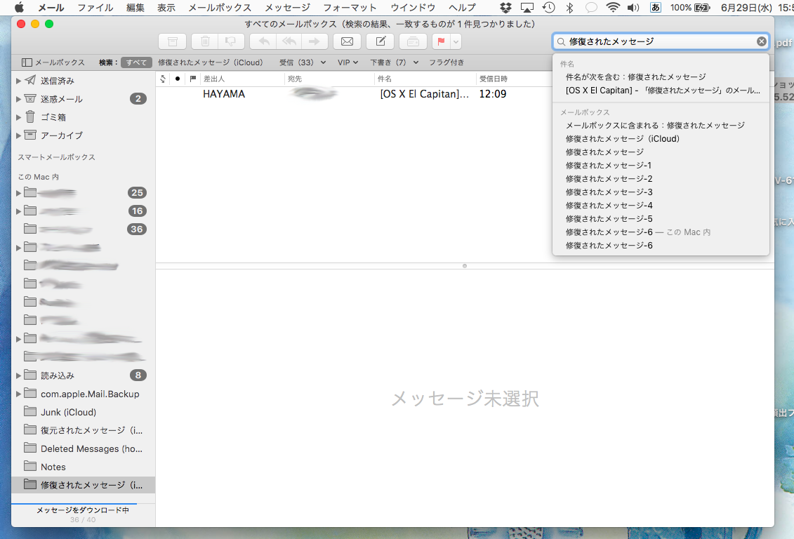 TimeMachineでメールを復元してみましたが、復元されたメッセ−ジボックスにはありません。