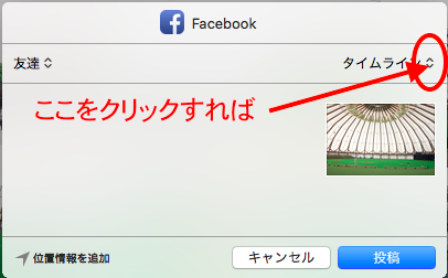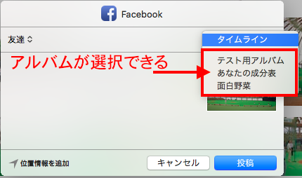 写真からFacebookへの投稿時、「タイムライン」のみでアルバムが選択できない