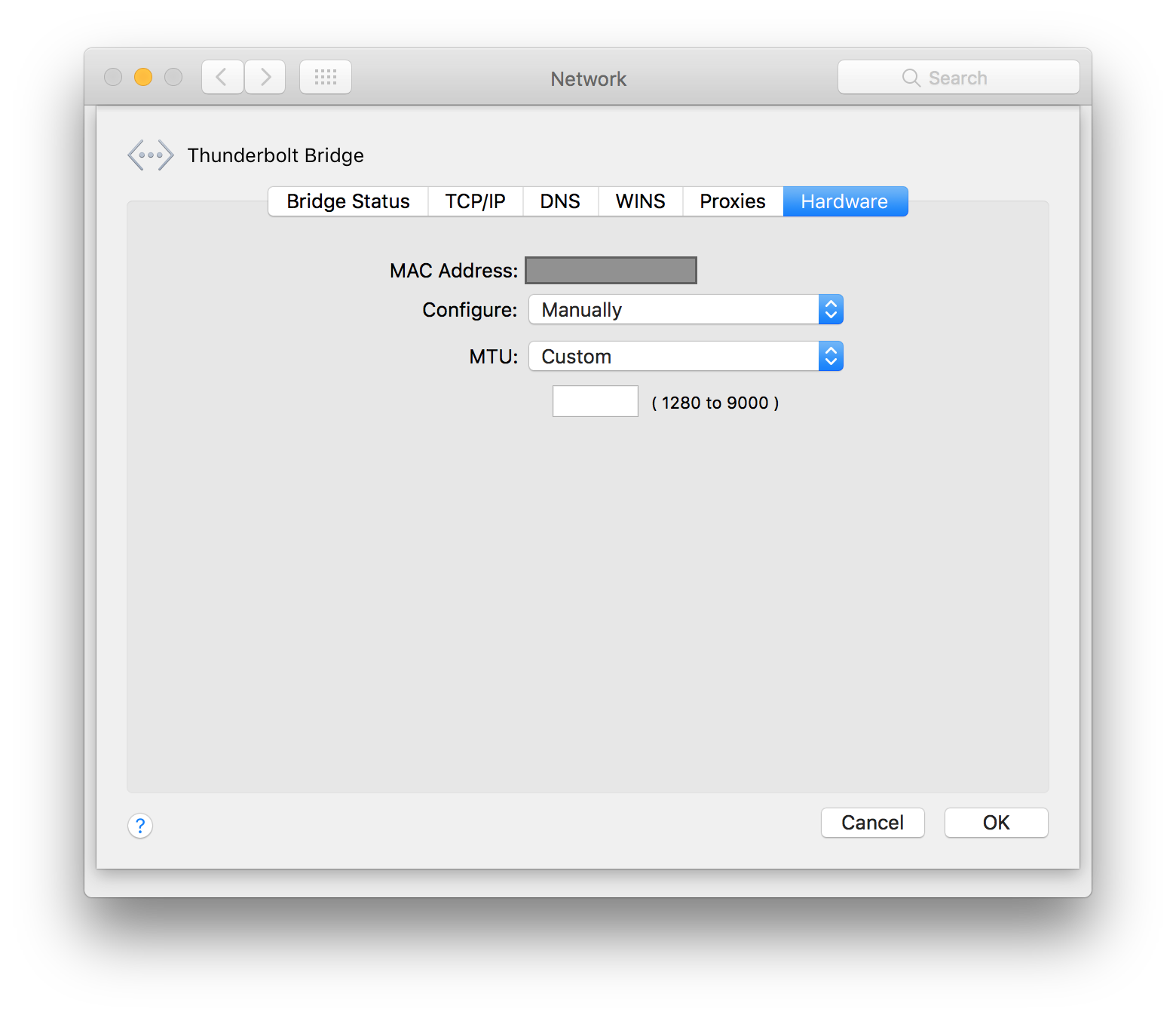 ところが私のところでは、このThunderbolt ブリッジはただ繋いでファイル共有をしてもたいした速度が出ません。確かOS X 10.10.x の頃から試しているのですが、単一ファイルのコピー(Finder からです。)で転送速度が不安定です。およそ2Gbps から0.3Gbps までの間でブレます。ネット上を検索すると7Gbps くらい出ているらしいのですが、実用のファイルコピーでスピードが出ません。