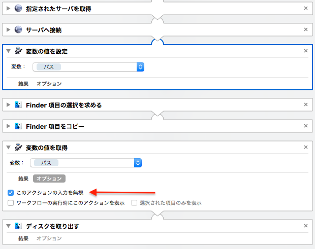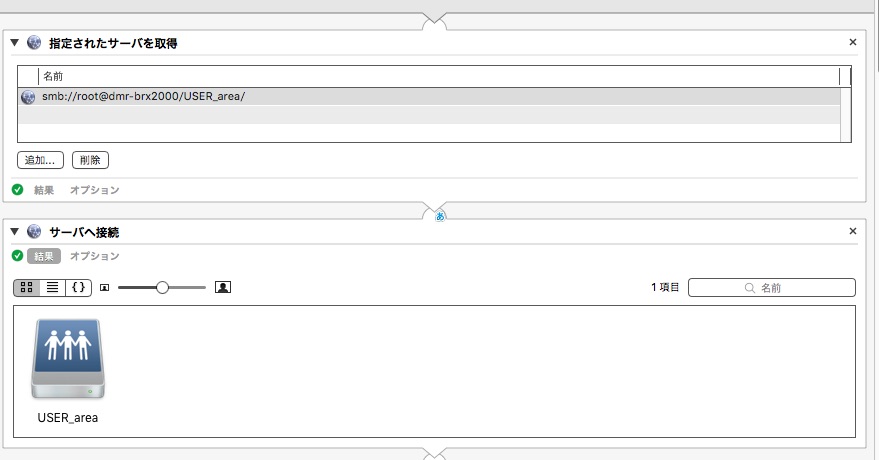 Automatorにおけるサーバー接続後の「Finder項目の選択」について