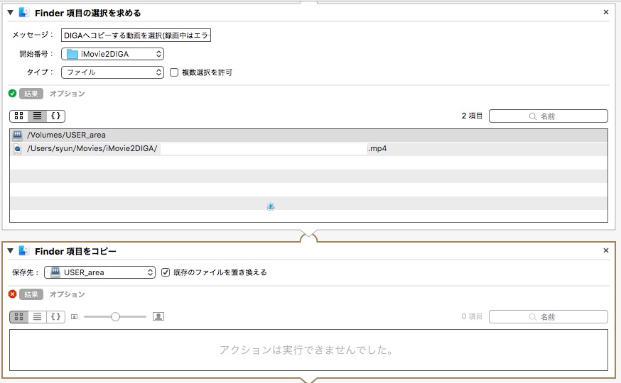 Automatorを使用して、Macで作成した動画(mp4)を同一ネットワーク上のブルーレイレコーダー(DIGA BRX2000)に自動でコピーしようと考えています。