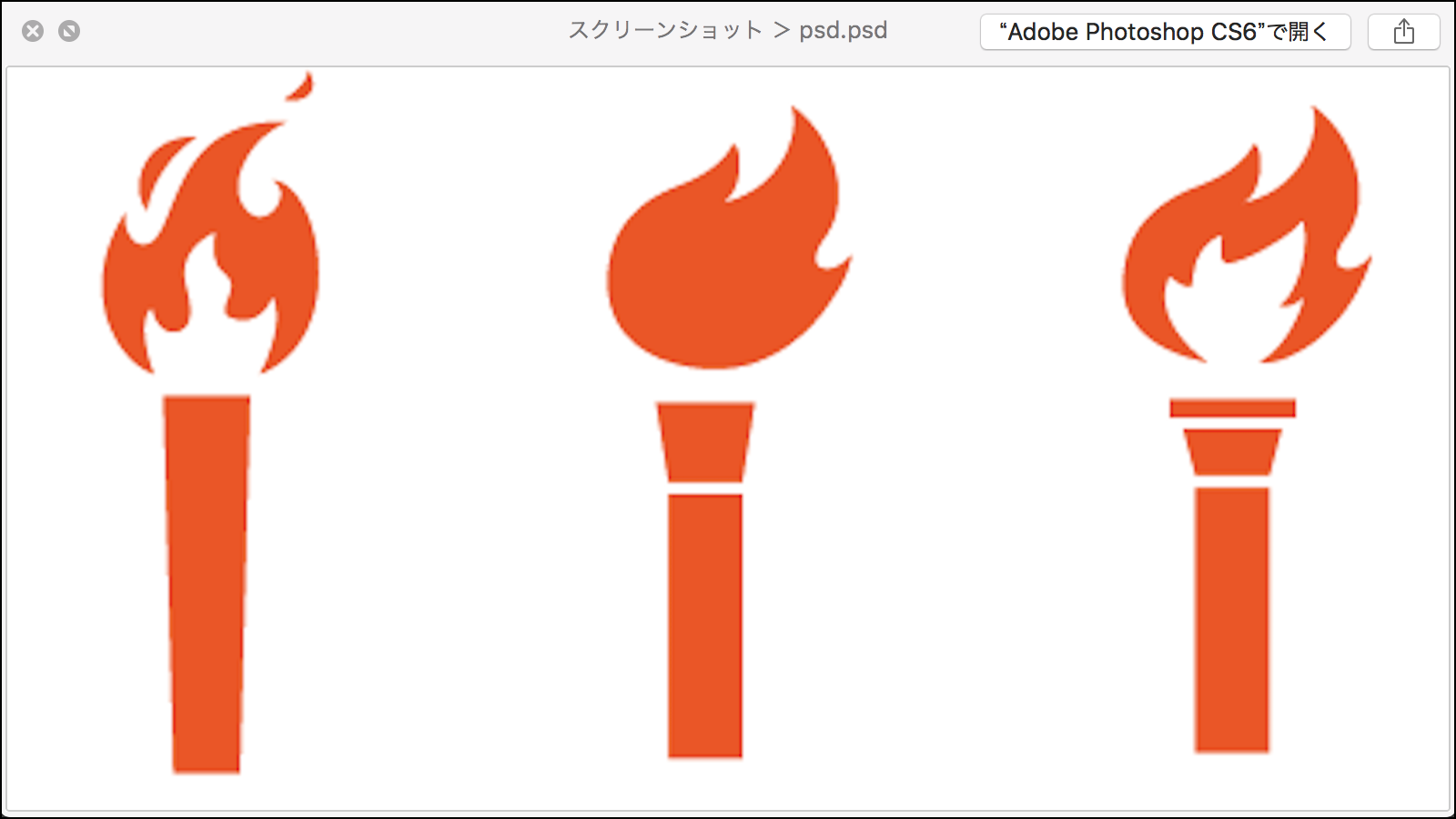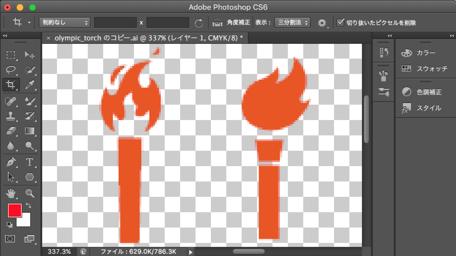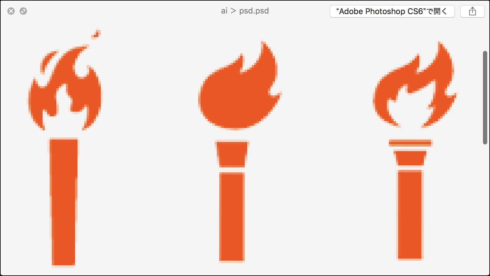 ダウンロードした「聖火の無料素材(ai)」を「Adobe Photoshop CS6」に読み込んだ時点(「アンチエイリアス」の設定は「ON」にしています)で、御覧の様にジャギジャギの画像になります。