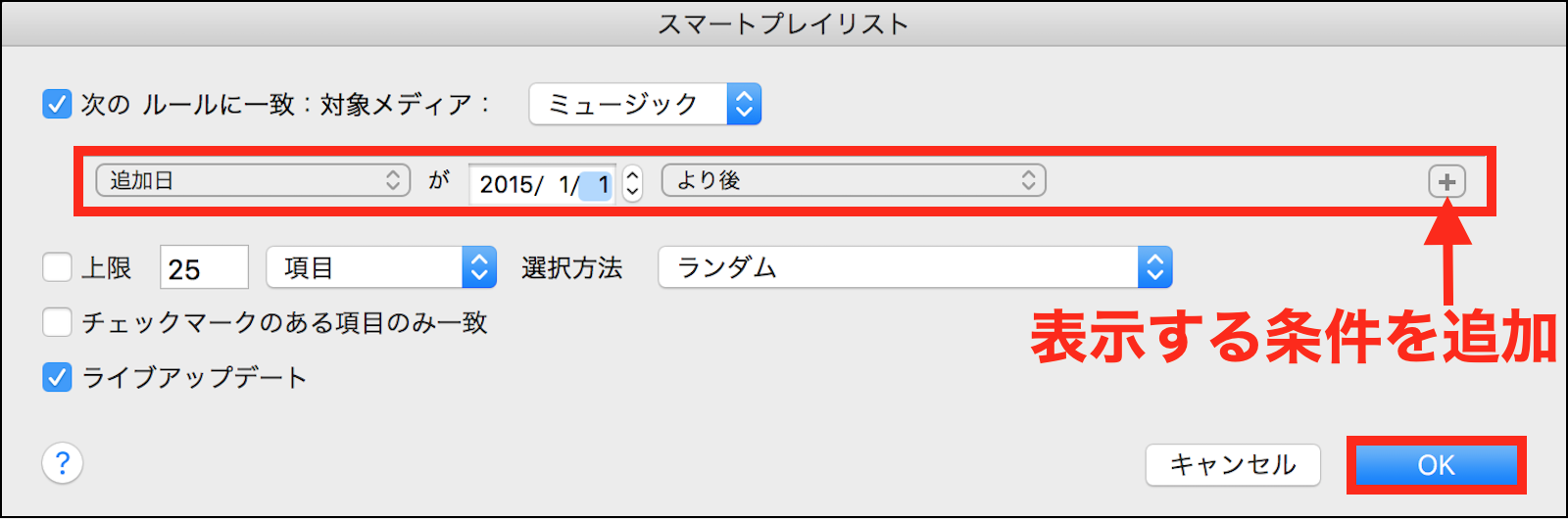 「option」+「command」+「N」キーで「スマートプレイリスト」の表示項目の設定パネルを表示させ、
